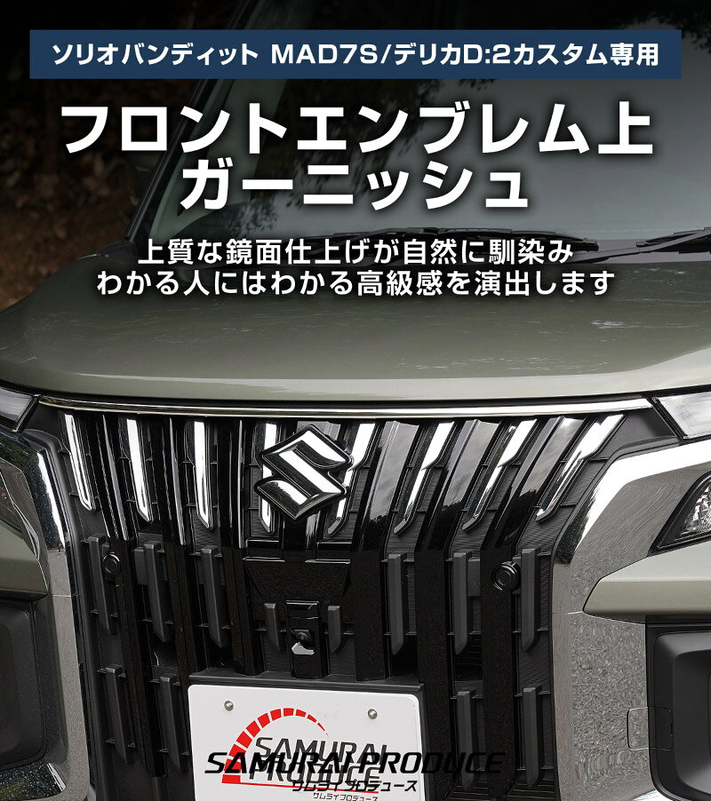 【12/4 P5倍】【期間限定価格】【予約】【セット割】新型ソリオバンディット MAD7S デリカD:2フロントエンブレム上ガーニッシュ & フロントリップ ガーニッシュ 2P 外装パーツセット 鏡面仕上げ 専用 アクセサリー 外装 ボンネット グリル【12月20日頃入荷予定】
